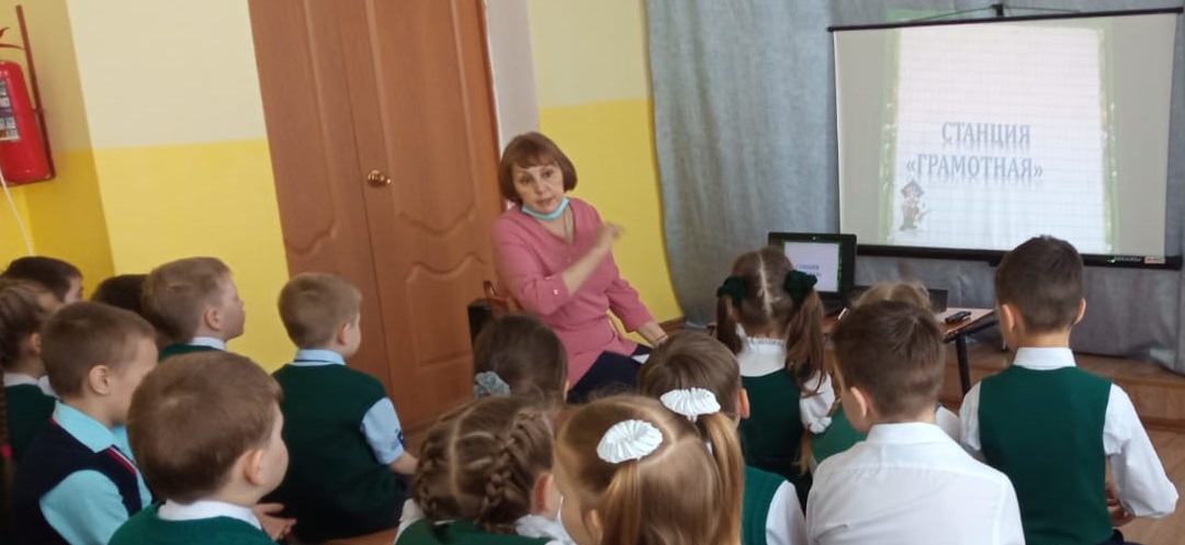 Первоклассники совершили увлекательное путешествие по станциям: «Угадай ребусы», Станция «Грамотная», «Антонимы», «Буквы заблудились», «Сказочная», «Пословичная».