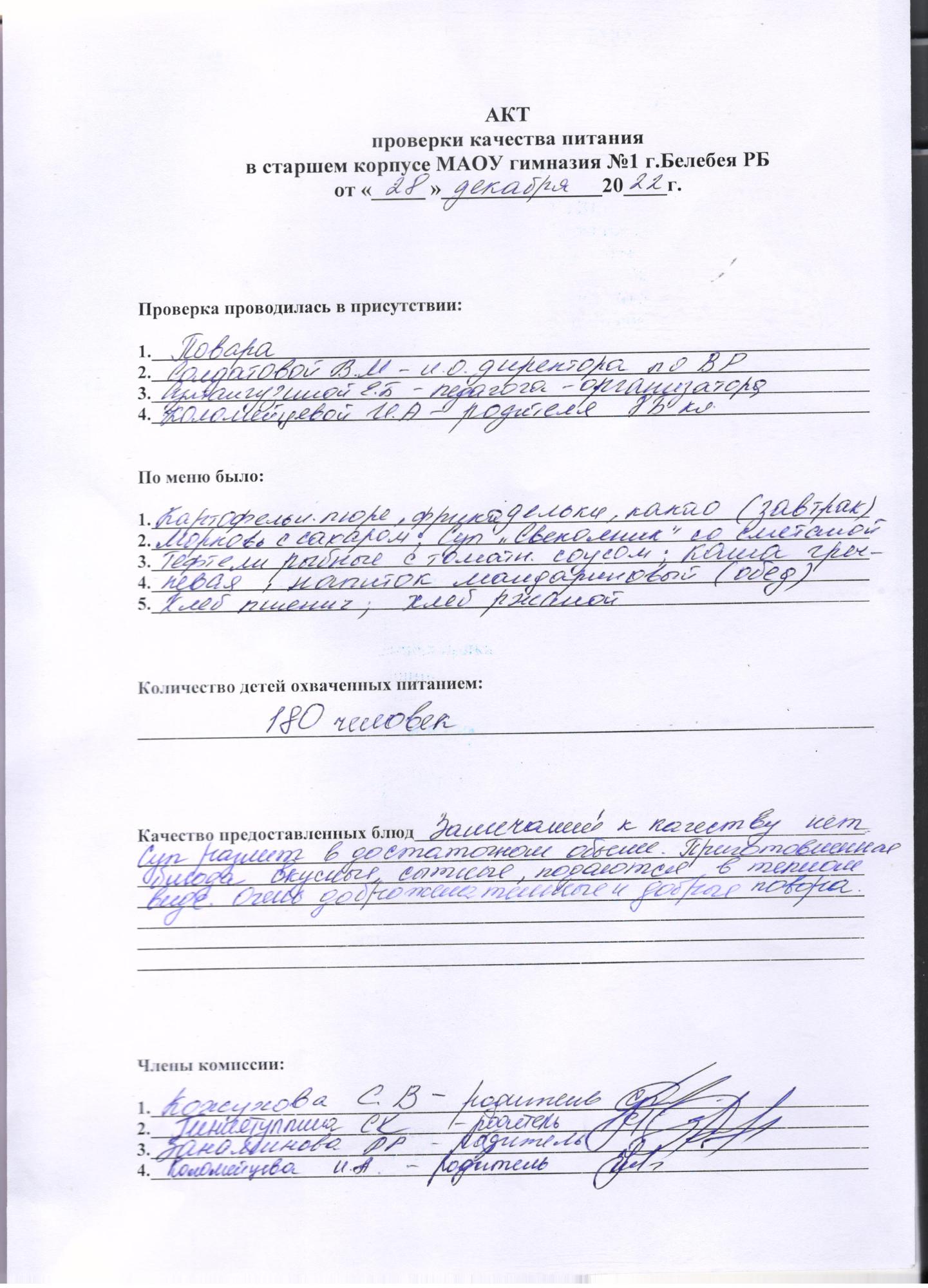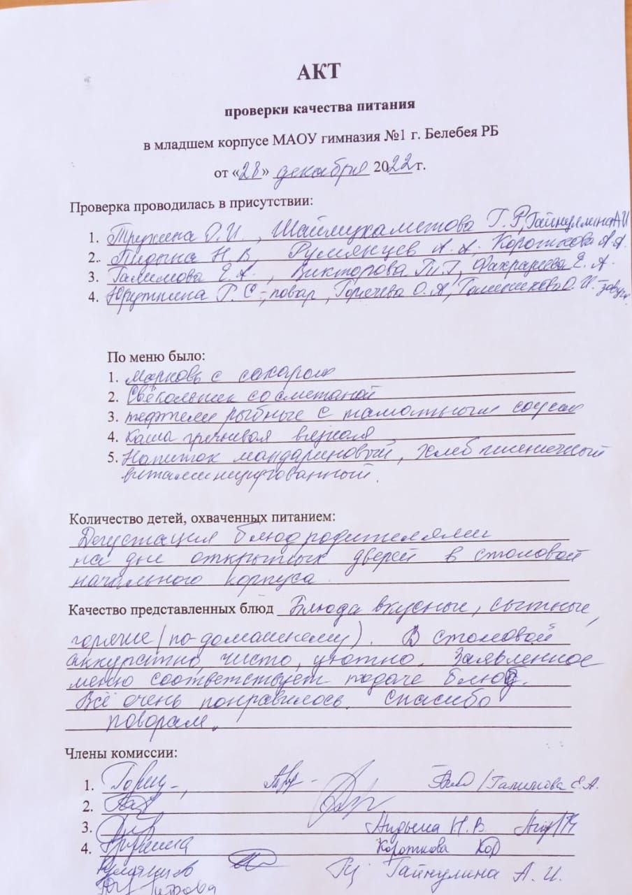 28 декабря 2022 года в рамках родительского контроля за организацией горячего питания обучающихся в МАОУ гимназия № 1 г. Белебея был проведен Единый республиканский день открытых дверей "Родители Башкортостана за здоровое питание!».