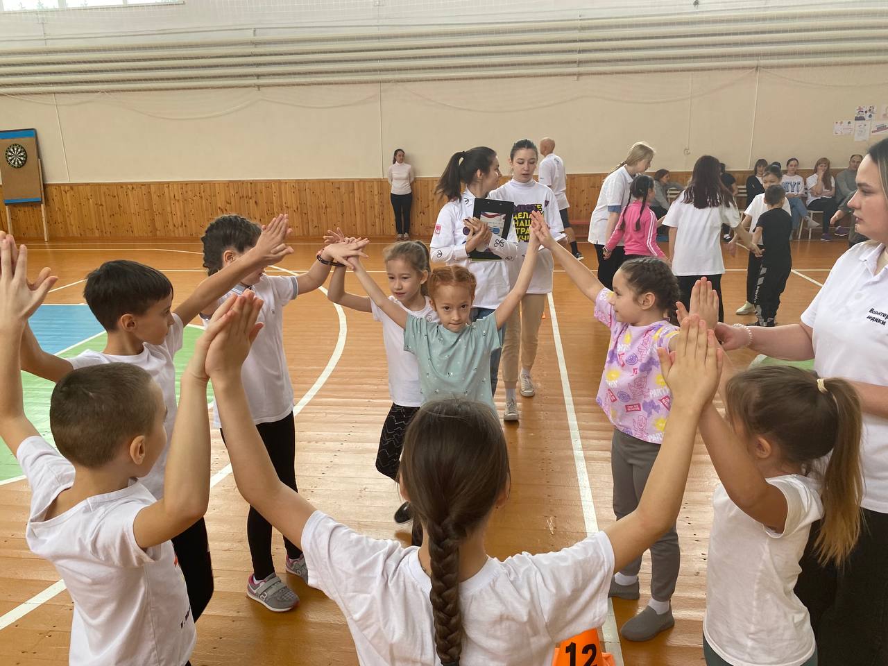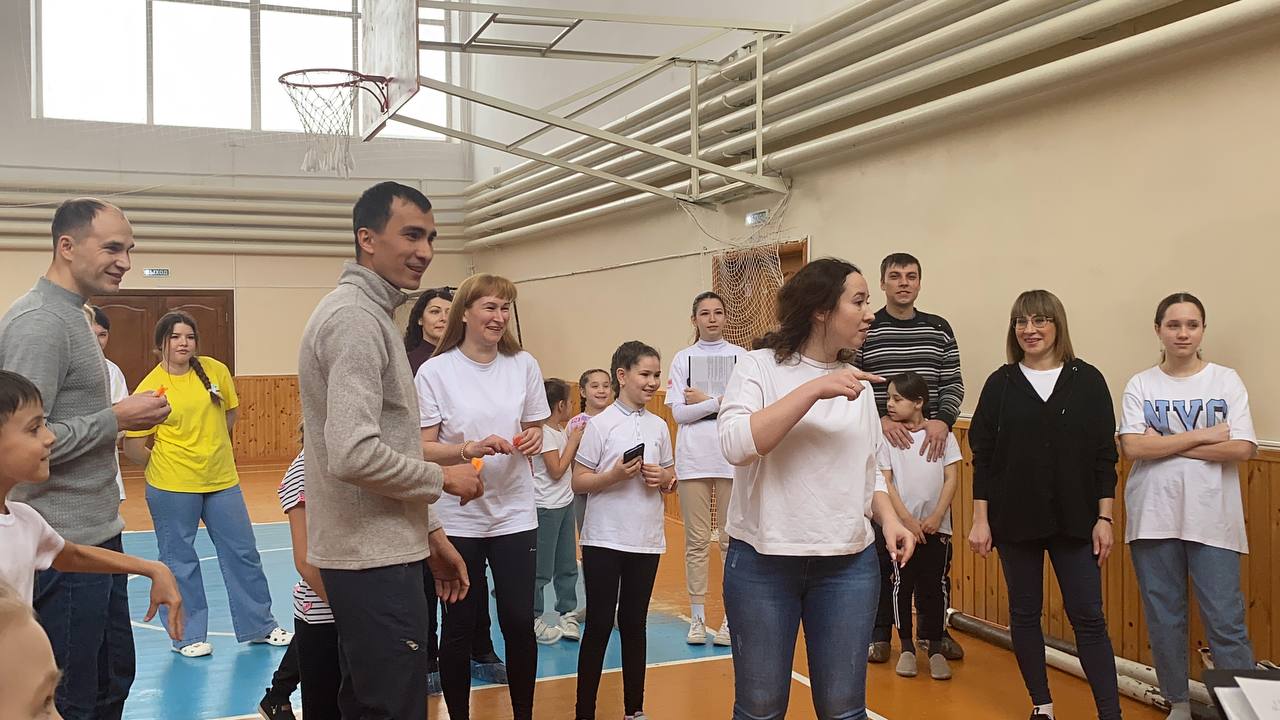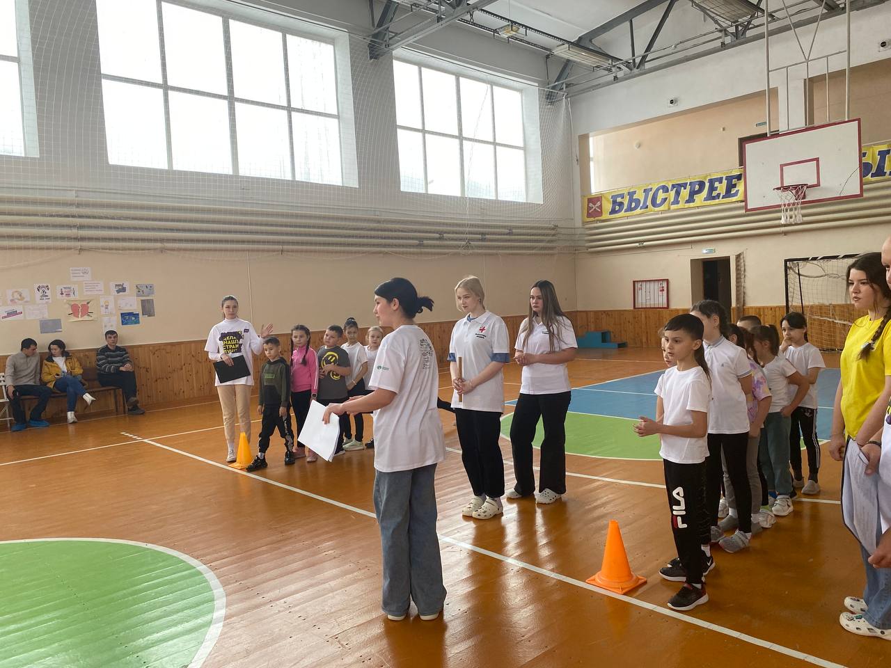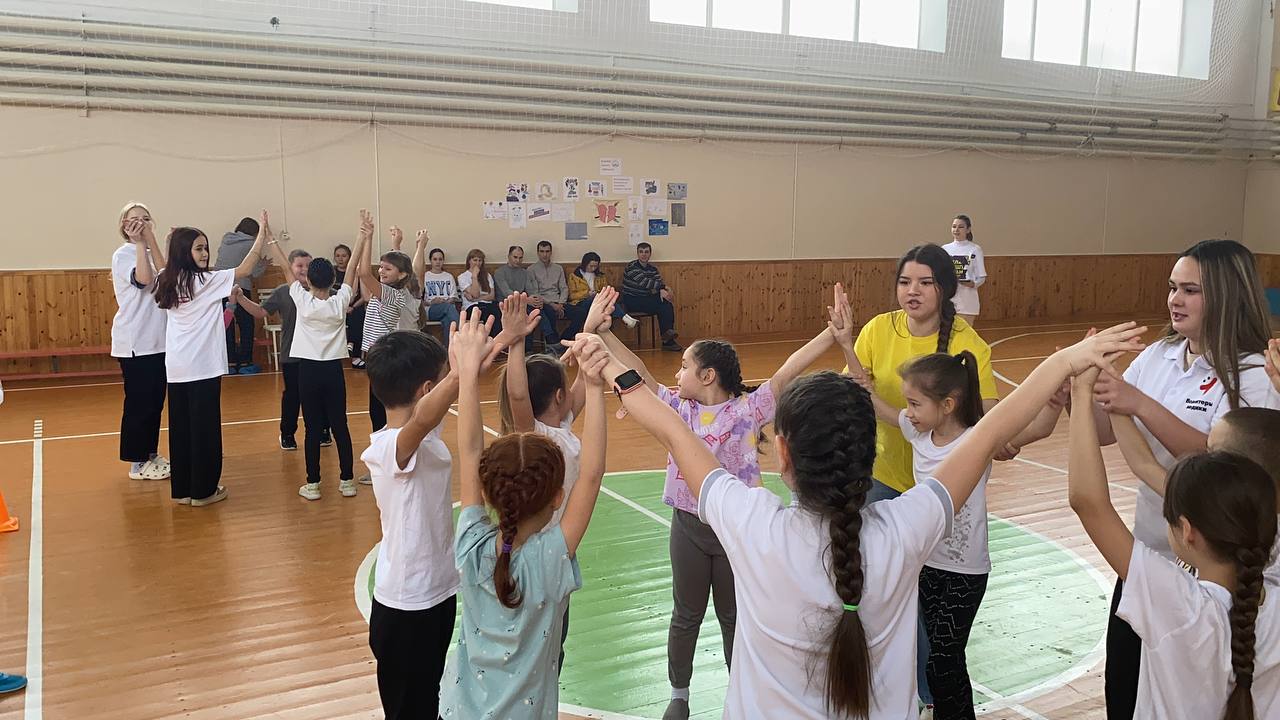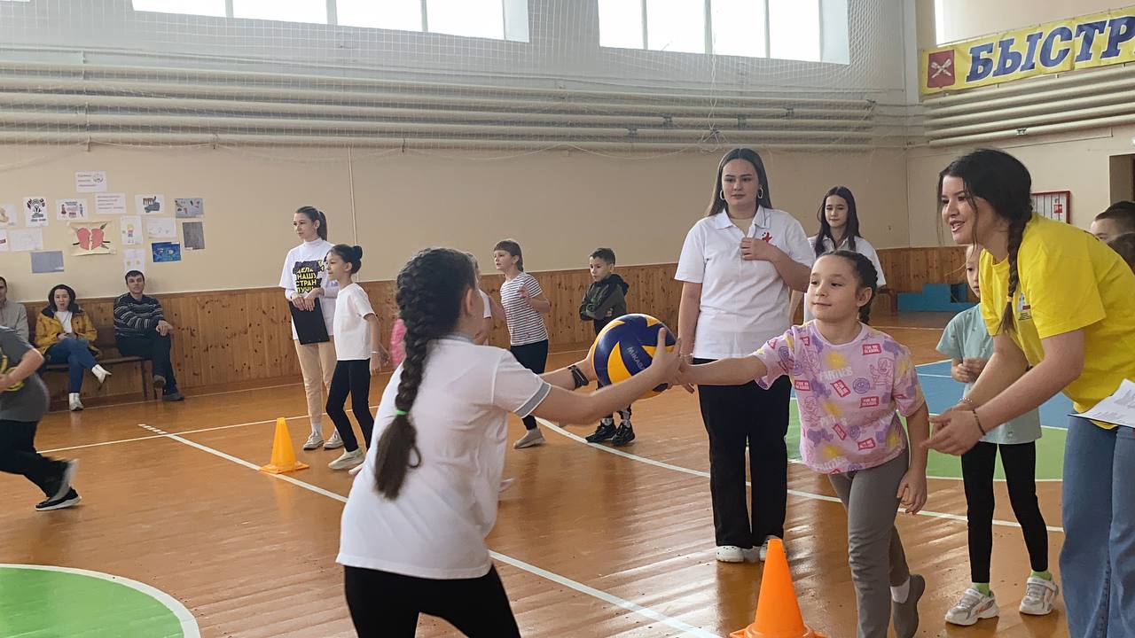 В красиво оформленном зале собрались участники, болельщики, жюри, чтобы поиграть в «Веселые старты», чтобы на миг вернуться в детство и снизить «дефицит» положительных эмоций у детей. На этом мероприятии, волонтёры провели ряд игр, викторину и конкурс загадок о спорте.
