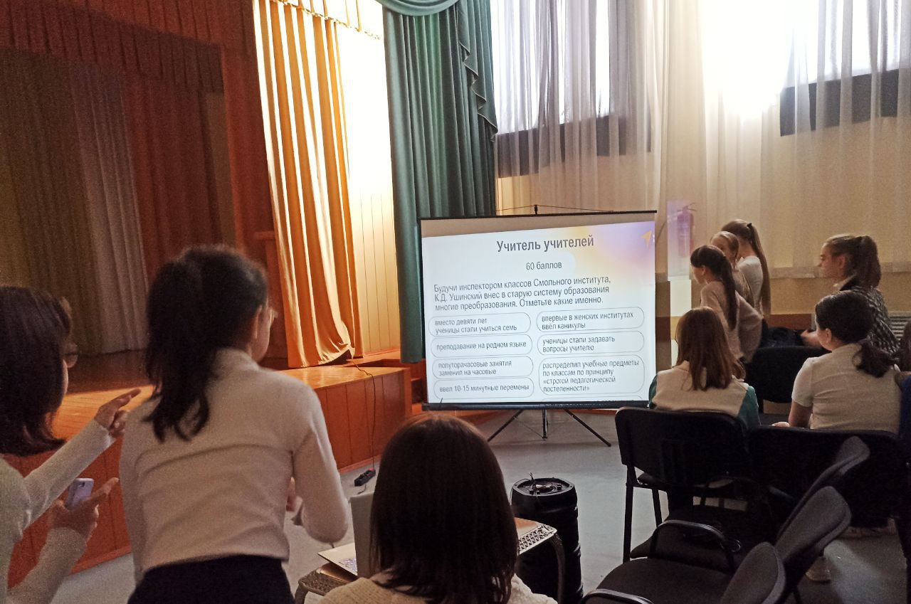 2 марта преддверье 200 летия со дня рождения Константина Дмитриевича Ушинского советник по воспитанию и взаимодействию с детскими общественными объединениями совместно с активом обучающихся провела интеллектуальную игру «Константин Ушинский – флагман педагогики» с целью защиты традиционных российских духовно-нравственных ценностей, культуры и исторической памяти обучающихся.