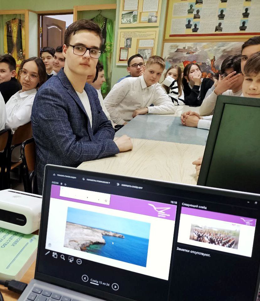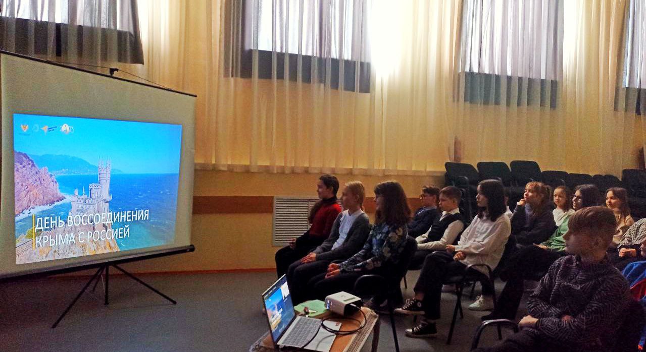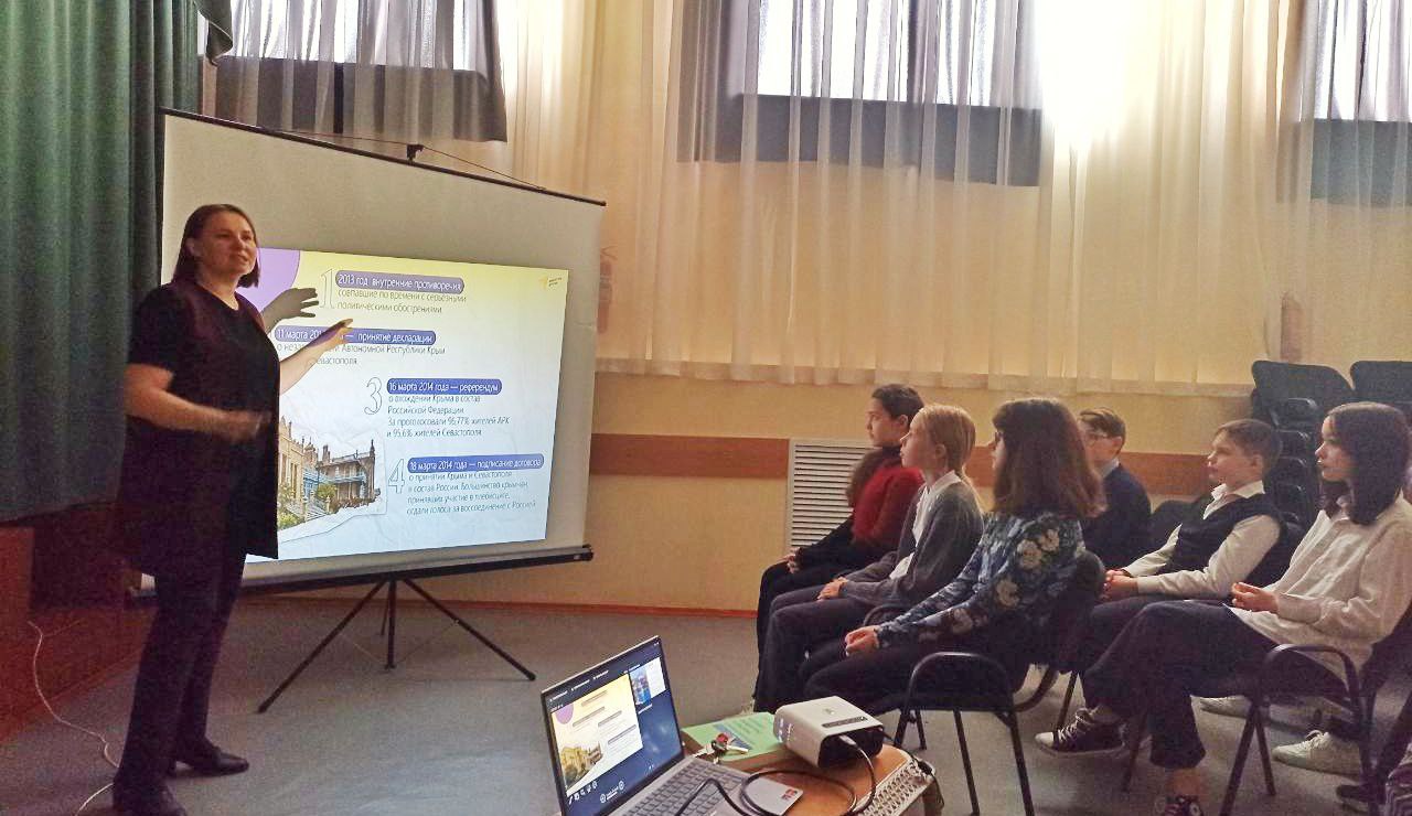 С целью гражданского воспитания и понимания важности сохранения исторических границ, сопричастность к прошлому, настоящему и будущему народа России советник директора по воспитанию и взаимодействию с детскими общественными объединениями для обучающихся среднего звена провела онлайн-экскурсию «История одного полуострова». Также был проведен открытый урок для параллели 6х классов на тему «День воссоединения Крыма с Россией» и исторический час «Воссоединение Крыма с Россией» среди 7 классов.