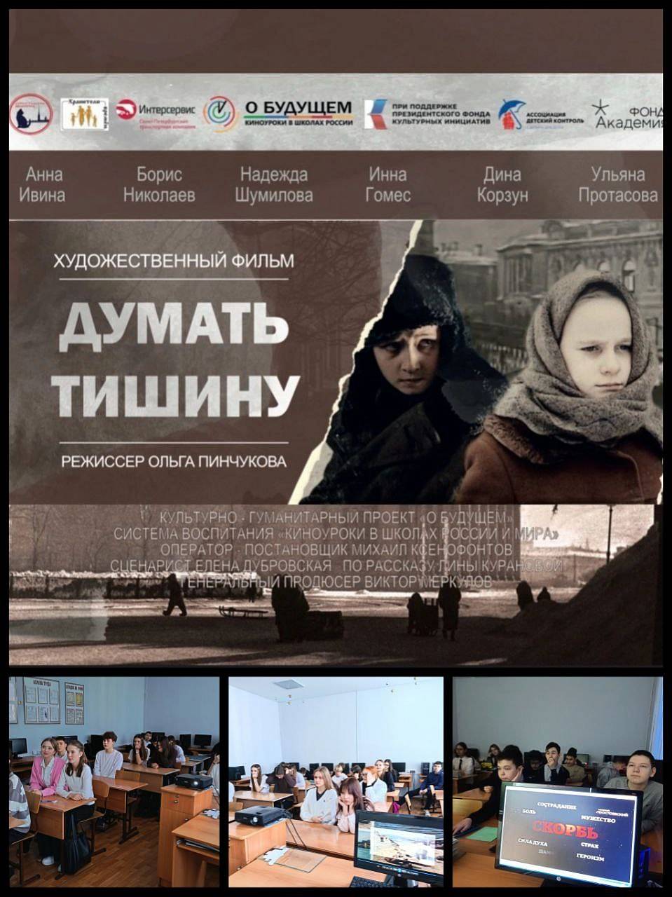 Сегодня, в рамках памятной даты — Дня снятия блокады Ленинграда, учащимся 8 классов была предоставлена уникальная возможность погрузиться в атмосферу суровых испытаний военного времени. Советник директора по воспитанию Султангузина Е.Б. организовала специальный киноурок под названием «Думать тишину».
