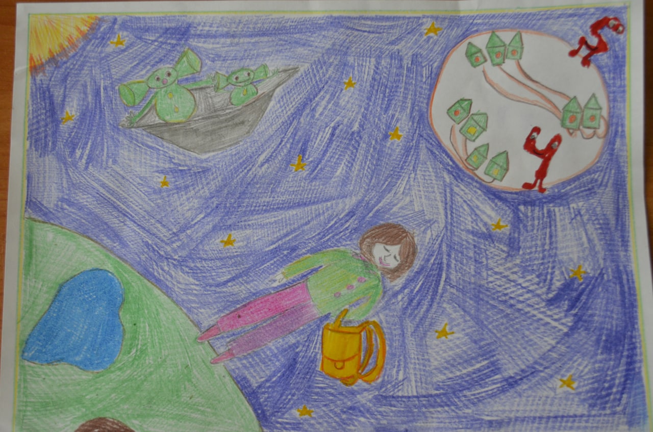 Ребята написали фантастические рассказы на тему межпланетных путешествий, и нарисовали иллюстрации к своему рассказу. Учащиеся с интересом слушали истории, и делились своим видением межпланетной жизни.